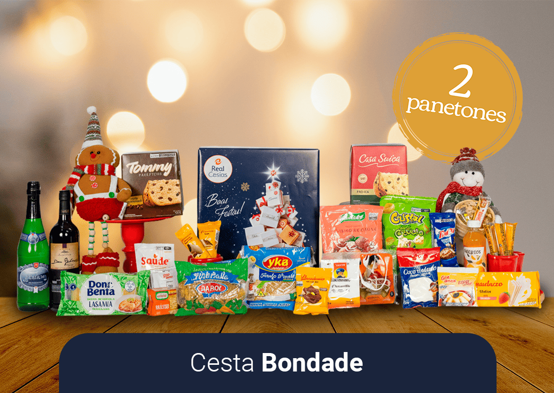 Itens inclusos na Cesta de Natal Bondade: 1 Chocotone 400g Tommy 1 Panetone 400g Casa Suiça 1 Espumante Fermentado 660ml Armand 1 Vinho Tinto 750ml Don Gabriel 1 Suco de Fruta 400ml Lindoya 1 Barrinha Goiabinha/Chocolate 25g Bauducco 1 Pão de Mel 30g Bauducco 1 Bolinho Recheado 27g Duo Bauducco 1 Biscoito Wafer 70g Bauducco Leia Mais